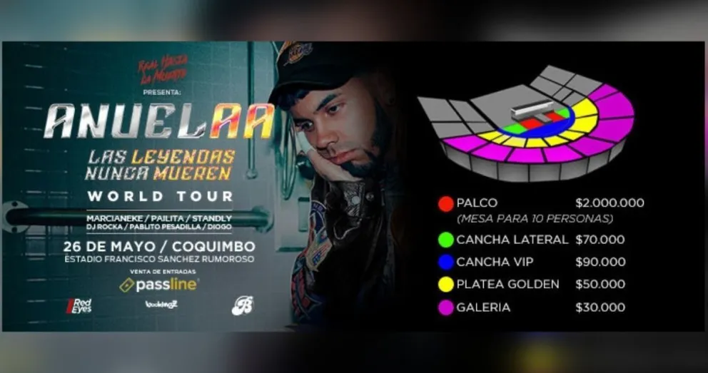 Para el primer concierto de Anuel AA en Chile, el 26 de mayo de en Coquimbo, las entradas se pueden comprar por el sistema Passline. Los valores van desde los $30.000 en sector de galería, hasta los $2 millones en palco (mesa para 10 personas).