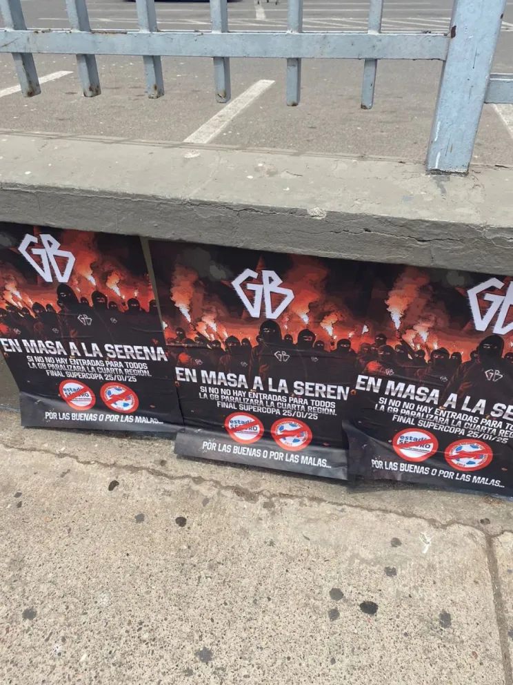 A este mensaje se suman los afiches que han sido pegados en los alrededores del Estadio La Portada, los cuales contienen una nueva amenaza. "En masa a La Serena. Si no hay entradas para todos, la GB paralizará la cuarta región. Por las buenas o por las malas", se leía en uno de los carteles, que también aparecieron en el Centro Deportivo Azul.