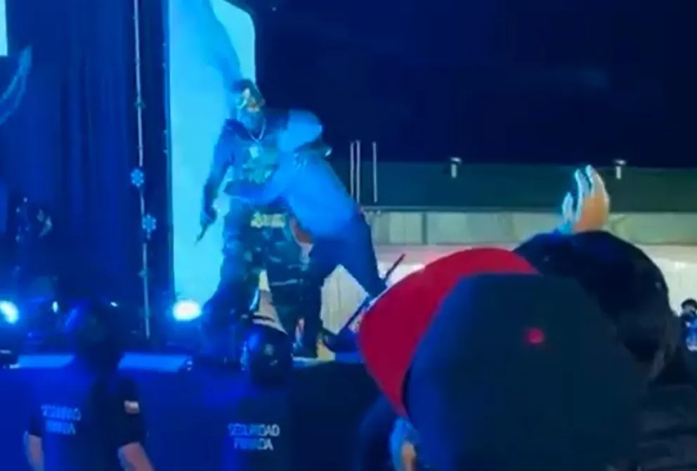 Pero de un momento a otro, un fanático salta al escenario y queda a los pies del artista urbano, que le da la mano para ayudarlo a pararse. Sin embargo, se aprecia cómo los guardias tiran hacia abajo al joven, lo que provoca que ambos caigan al piso.