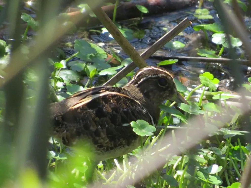 Desplazándose sin problemas en el humedal Río Elqui en La Serena, y en busca de alimento, se registró un ejemplar adulto de Becacina Pintada (Nycticryphes semicollaris), un tipo de ave playera pequeña, de cuerpo compacto de color café con dibujos llamativos en su plumaje, pico curvado y patas verdes.