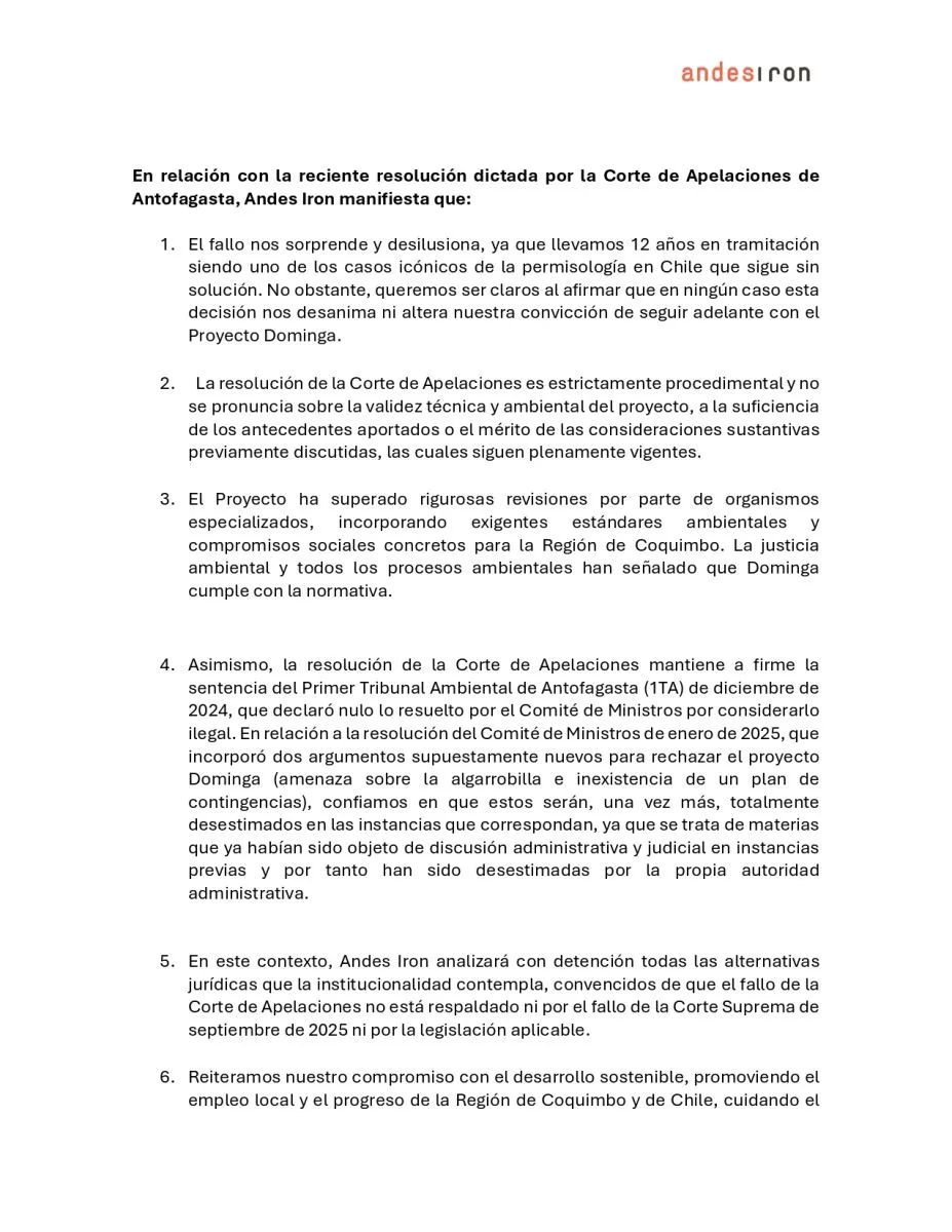 En el comunicado, Andes Iron sostuvo que Dominga ha superado revisiones de organismos especializados y que cumple con la normativa vigente, incorporando estándares ambientales exigentes y compromisos sociales para la Región de Coquimbo. Asimismo, destacaron que la resolución mantiene vigente la sentencia del Primer Tribunal Ambiental de Antofagasta, dictada en diciembre de 2024, que declaró nula la decisión previa del Comité de Ministros por considerarla ilegal.