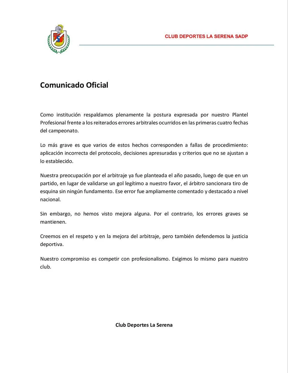A raíz de ello, el Club Deportes La Serena emitió este domingo un comunicado oficial en el cual respaldó la postura de su plantel profesional frente a reiterados errores arbitrales que, según la institución, han marcado las primeras cuatro fechas del campeonato.